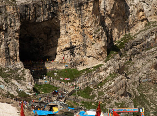 Amarnath Temple is a Hindu shrine located in Jammu and Kashmir, India. The cave is situated at an altitude of 3,888 m (12,756 ft), about 141 km (88 mi) from Srinagar, the summer capital of Jammu and Kashmir, reached through Pahalgam town. The shrine represents an important part of Hinduism. The cave, located in Lidder Valley, is surrounded by glaciers, snowy mountains and is covered with snow most of the year, except for a short period of time in summer when it is open to pilgrims. In 1989, pilgrims numbered between 12,000 and 30,000. In 2011, the numbers reached a peak, crossing 6.3 lakh (630,000) pilgrims. In 2018 pilgrims numbered 2.85 lakh (285,000). The annual pilgrimage has varied between 20 and 60 days.